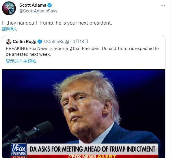 美國知名漫畫家斯科特·亞當斯也贊同馬斯克的觀點,即特朗普被起訴反而會提高他在美國大選中的獲勝機會?!叭绻麄兘o特朗普戴上手銬,他就會成為你們的下一任總統(tǒng),”亞當斯說。