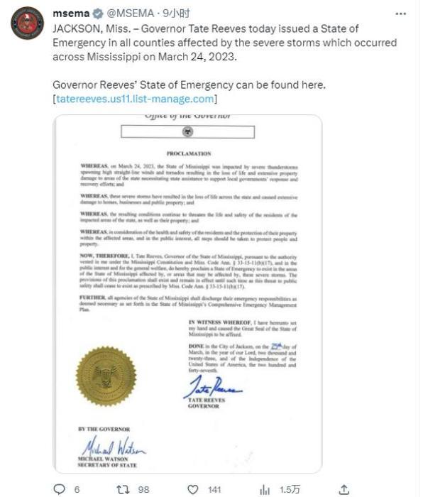 圖片來源:密西西比州緊急事務(wù)管理局社交媒體賬號(hào)截圖