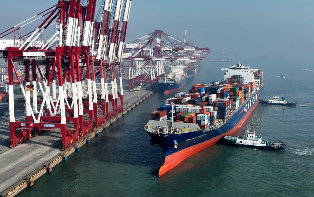 2023年1月1日,滿載集裝箱的法國“達(dá)飛阿瑪維瓦”輪正在靠泊青島港前灣QQCT集裝箱碼頭(無人機(jī)照片)。新華社記者李紫恒攝