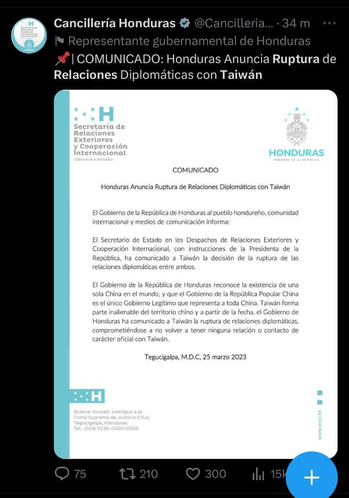 洪外交部通過推特發(fā)布的“斷交”聲明。