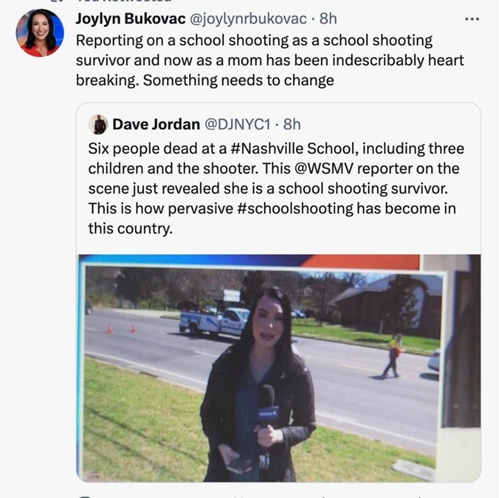 田納西州當(dāng)?shù)仉娨暸_記者喬伊林·布科瓦茨趕往現(xiàn)場報道槍擊案,并在連線出鏡時坦露,自己曾在學(xué)生時代遭遇校園槍擊案。