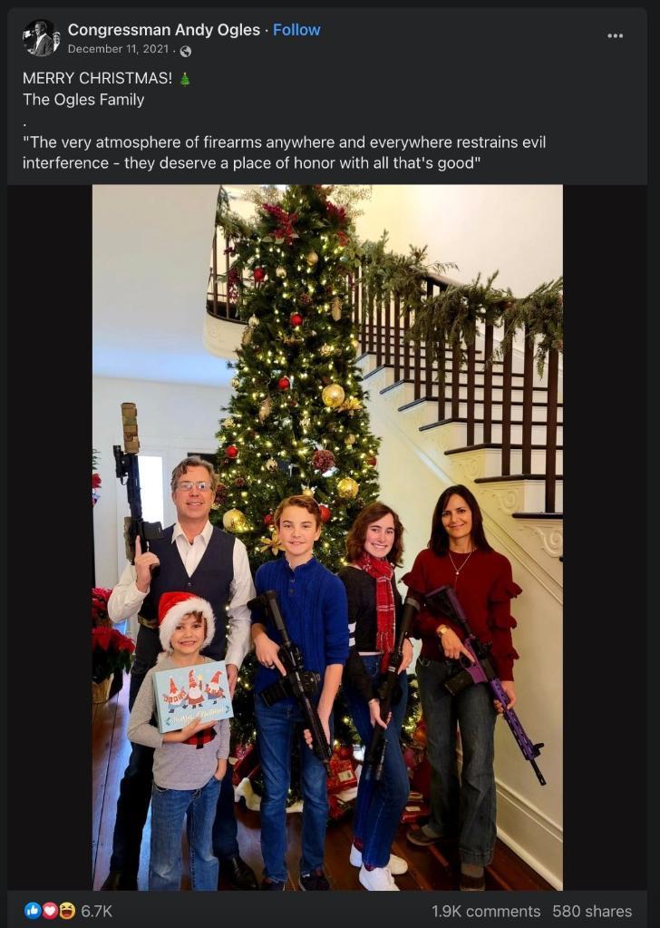 在這起校園槍擊案發(fā)生后,網(wǎng)友們立即扒出老照片——來自田納西州的眾議員安迪·奧格斯為表露自己的“挺槍”立場,曾在圣誕節(jié)前夕專門拍攝“持槍全家?!保ㄎ闯赡旰⒆釉趦?nèi)的一家人站在圣誕樹前,面帶微笑,手持槍支。