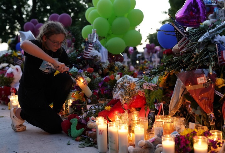 2022年5月28日,在美國得克薩斯州南部尤瓦爾迪市的城市廣場,市民哀悼槍擊事件遇害者。尤瓦爾迪市5月24日發(fā)生惡性校園槍擊事件,造成至少19名兒童和2名教師死亡。這是美國近十年來遇害人數(shù)最多的一起校園槍擊事件。新華社記者 吳曉凌 攝
