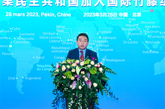 國際竹藤組織理事會主席、喀麥隆林業(yè)和野生動物部部長恩東戈·朱爾·多雷,國際竹藤組織董事會聯(lián)合主席江澤慧,中國外交部國際經(jīng)濟司參贊張雷,中國國家林業(yè)和草原局副局長譚光明,乍得共和國駐華使館代辦馬魯米,剛果民主共和國農(nóng)業(yè)部部長姆津加·比利漢澤·德西雷出席并致辭。