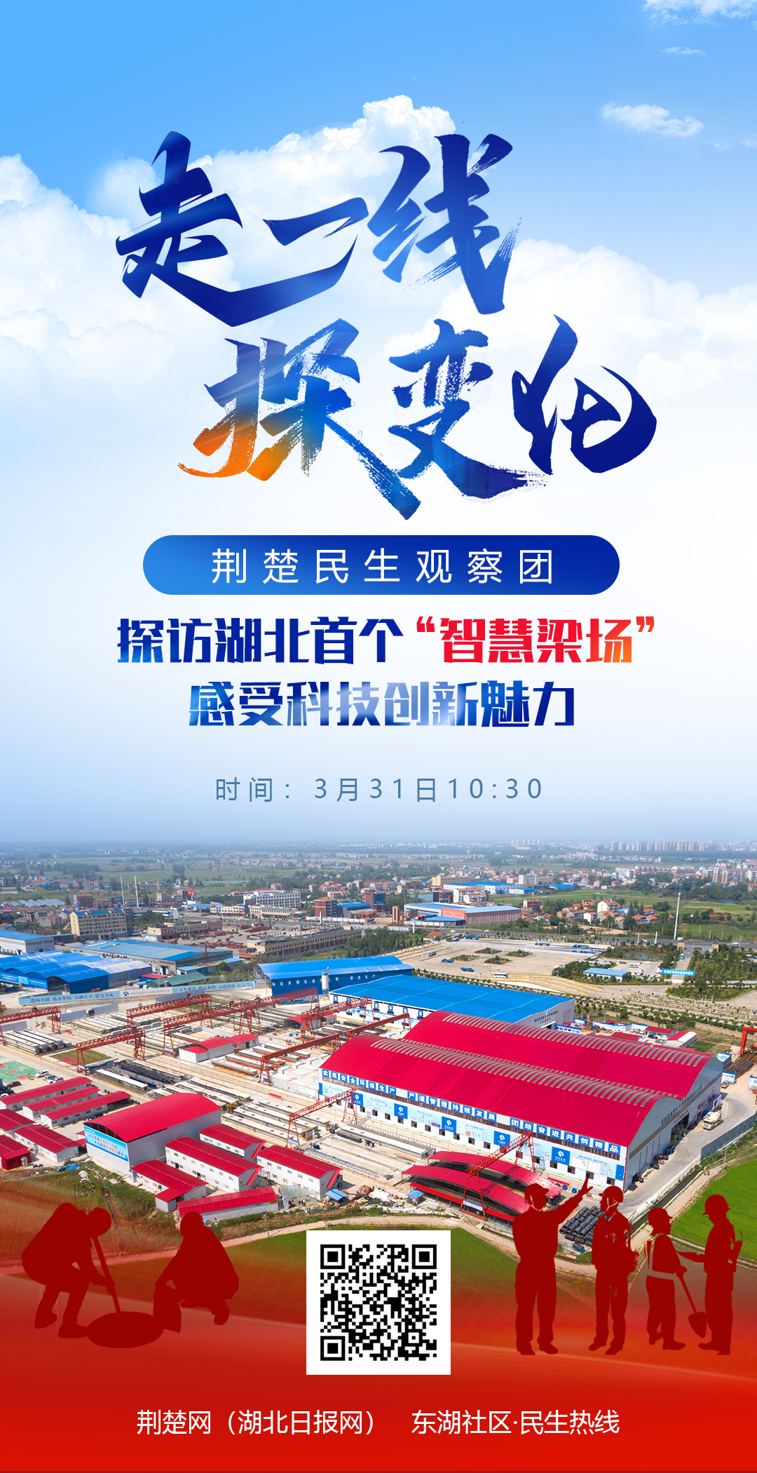 3月31日上午10:30-12:00,荊楚網主播將帶領荊楚民生觀察團走進湖北孝漢應高速公路項目工地,探訪湖北首個“智慧梁場”,近距離參觀箱梁施工工藝流程,感受科技創(chuàng)新魅力。屆時,荊楚網客戶端將進行現(xiàn)場直播,歡迎掃碼觀看。