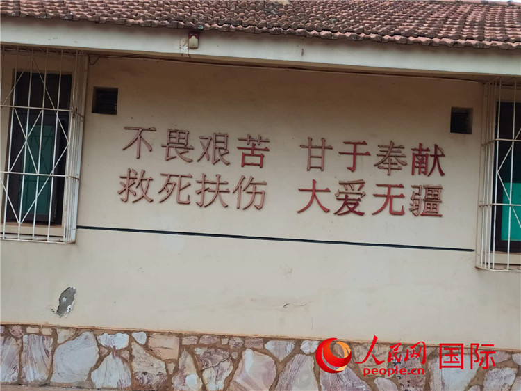 | 醫(yī)療隊生活區(qū)住地墻上的16個大字格外醒目。人民網記者 黃培昭攝 |