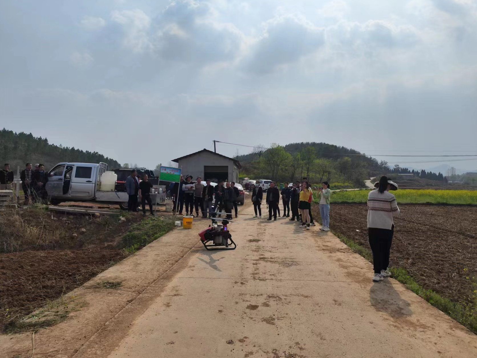 圖為:無(wú)人機(jī)操作員遙控指揮飛機(jī)噴施農(nóng)藥