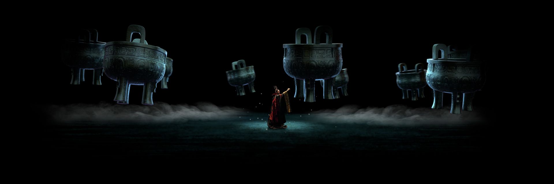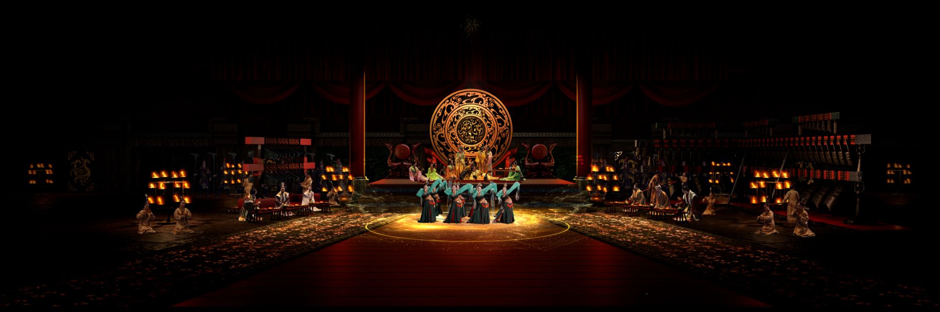 久遠(yuǎn)的歷史,因全息舞臺(tái)凸顯出強(qiáng)大藝術(shù)感染力。楚巫的神秘,楚舞的優(yōu)雅,楚歌的委婉,匯聚成楚文化的動(dòng)人魅力。楚國(guó)將士金戈鐵馬,楚宮歌女身姿婀娜,火神鳳凰神奇夢(mèng)幻。經(jīng)過(guò)3D建模后呈現(xiàn)的編鐘、虎座鳳架鼓和楚劍等楚文化代表性文物極具視覺(jué)沖擊力。