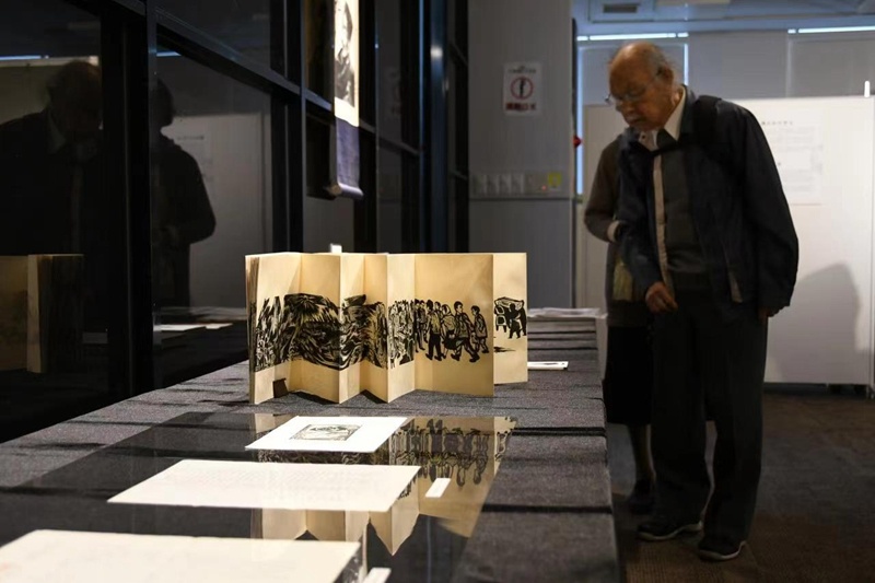 一名參觀者在“和平之心——穿越時空的友情”版畫展現(xiàn)場欣賞作品。