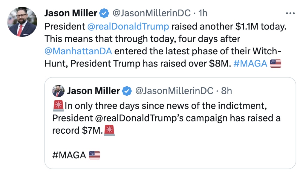 特朗普競(jìng)選團(tuán)隊(duì)高級(jí)顧問(wèn)賈森·米勒3日在社交媒體上宣布,自特朗普被刑事起訴的決定公布以來(lái),該團(tuán)隊(duì)已募集800萬(wàn)美元競(jìng)選資金。