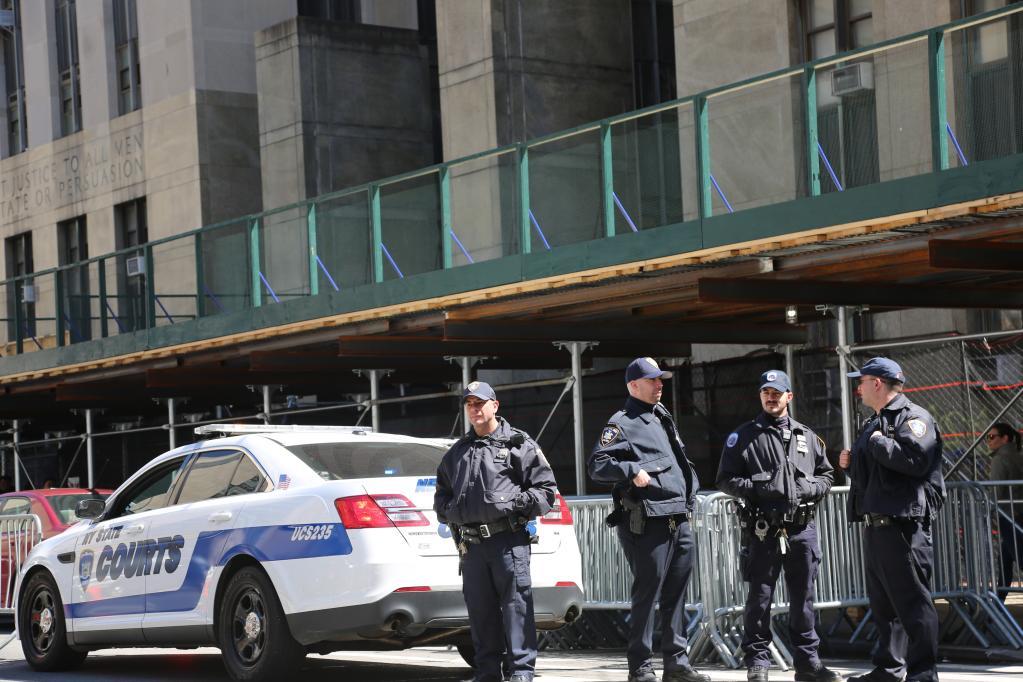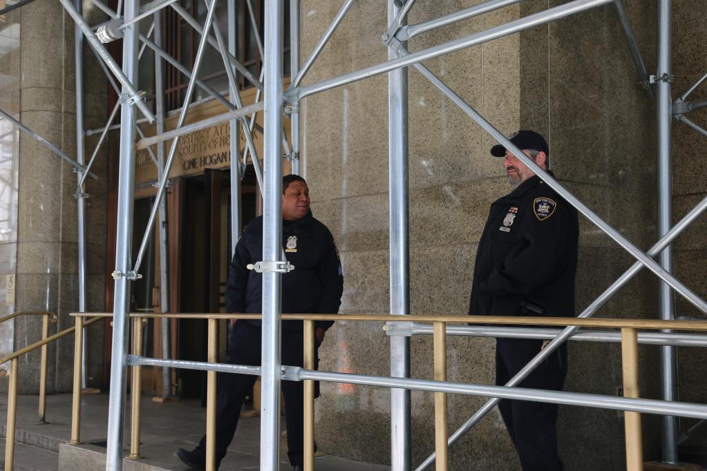 當(dāng)?shù)貢r(shí)間3日上午,記者看到,曼哈頓地區(qū)檢察官辦公室和刑事法院共同所在的大樓周圍已設(shè)置了更多柵欄,部分路段設(shè)置的還是雙層?xùn)艡?;大樓出入口和附近交通路口均有警察值守;大樓外還有身著防彈背心的法警。