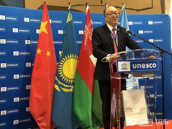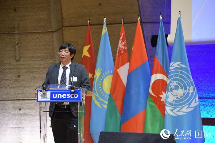 | 中國常駐聯(lián)合國教科文組織代表楊進(jìn)在絲綢之路杰出藝術(shù)作品展覽推介儀式上致辭。人民網(wǎng)記者 劉玲玲攝 |