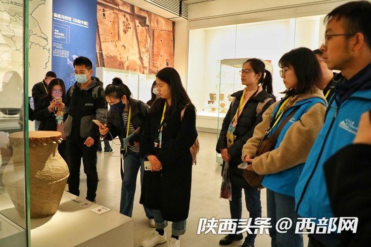媒體團記者在陜西考古博物館展廳內(nèi)了解展品背后的故事。