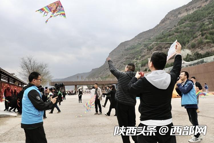 媒體記者在壺口瀑布岸邊體驗(yàn)放風(fēng)箏。
