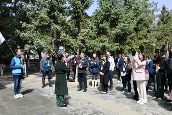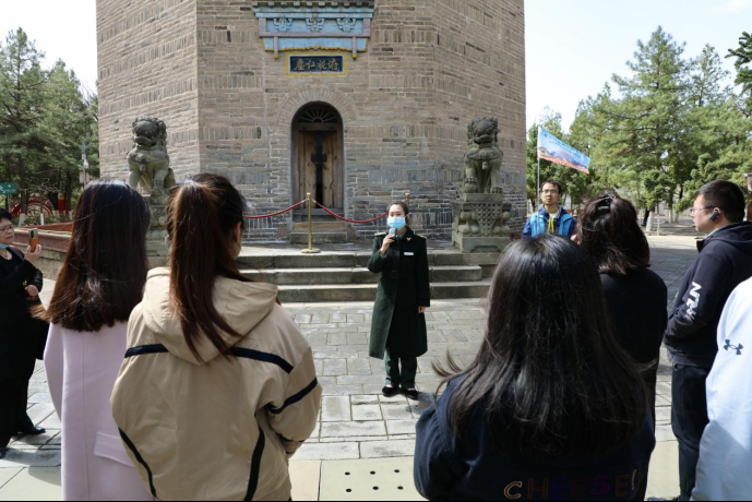 遠山蒼翠,松柏挺立,隨著觀光車緩緩駛至半山腰,寶塔山巍然聳立在一片郁郁蔥蔥中。媒體團記者們跟隨講解員的解說,仔細了解關(guān)于寶塔山傳承的延安精神,一同步行至寶塔山山頂。