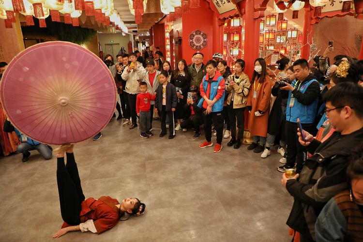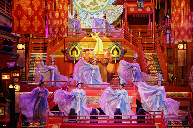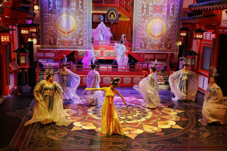 一層是以“和合之美·風(fēng)雅長安”為主題的唐風(fēng)主題互娛休閑空間,這里衣香袂影,霓裳起舞,在南北中庭公共區(qū)域的三大舞臺,唐朝仕女身著飄逸襦裙,演藝霓裳羽衣舞、春江花月夜、秦王點(diǎn)兵、凌波舞、踏搖娘、公孫劍舞等特色演出,將“衣香袂影是盛唐”的場景完美呈現(xiàn)。