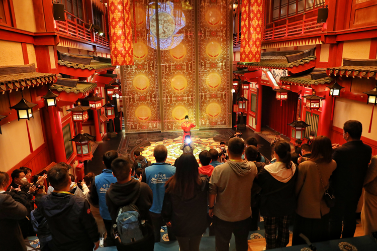 二層則是“花萼相輝·夜宴長安”主題文化宴席體驗(yàn)空間,以“唐食嗨吃、換裝推本、唐風(fēng)雅集、微縮長安、情景演藝、文化盛宴”等六大沉浸場為核心,大家能在長安十二時(shí)辰充分享受到“觀一場唐風(fēng)唐藝、聽一段唐音唐樂、演一出唐人唐劇、品一口唐食唐味、玩一回唐俗唐趣、購一次唐物唐禮”的一秒入唐體驗(yàn)。