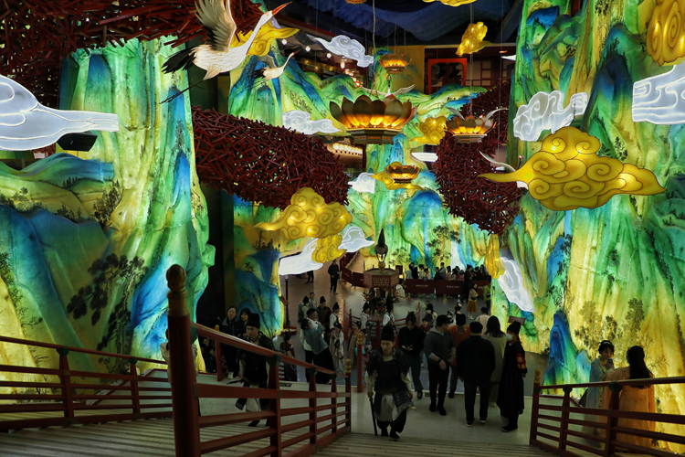 其中,南側(cè)中庭的“花舞大唐”最為出彩,場景布置還原《長安十二時(shí)辰》中許鶴子上元節(jié)花車斗彩巡游的場景,將原有兩層空中連廊巧妙利用,充分發(fā)揮三層中空的立體空間,營造一處公共演藝舞臺,既符合現(xiàn)代商業(yè)公共空間設(shè)定,又營造出影視劇中燦爛奪目的舞臺效果。