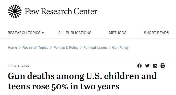中國(guó)日?qǐng)?bào)網(wǎng)4月7日電 皮尤研究中心6日發(fā)布了一項(xiàng)根據(jù)美國(guó)疾病控制與預(yù)防中心(CDC)最新年度死亡統(tǒng)計(jì)數(shù)據(jù)的分析報(bào)告,結(jié)果顯示,2019年至2021年期間,美國(guó)死于槍擊的兒童和青少年人數(shù)猛增了50%。