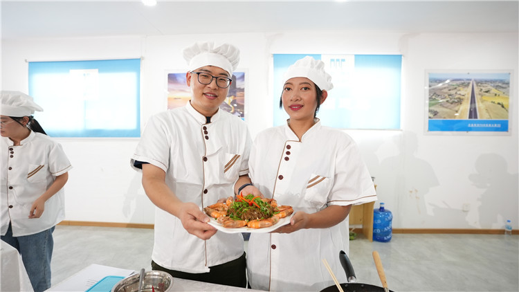 4月6日,柬埔寨新金邊國際機(jī)場項目建設(shè)現(xiàn)場,劉曉仙(左)和曼玉良在中國建筑(柬埔寨)職工廚王爭霸賽上展示“中建(柬)一家親”炒米粉。中國建筑供圖
