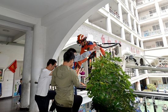 “火災(zāi)”發(fā)生后,學(xué)校立即啟動(dòng)應(yīng)急疏散預(yù)案:由老師組織學(xué)生有序疏散、安保人員進(jìn)行初期火災(zāi)撲救,同時(shí)撥打119電話報(bào)警。消防人員到場(chǎng)后迅速開(kāi)展滅火救援,并利用云梯消防車成功解救兩名行動(dòng)不便的被困高樓層的學(xué)生。