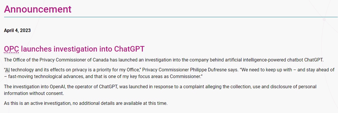 人民網(wǎng)訊 據(jù)加拿大廣播公司(CBC)當(dāng)?shù)貢r(shí)間4月4日?qǐng)?bào)道,加拿大隱私專(zhuān)員辦公室(Office of the Privacy Commissioner,OPC)宣布,由于OpenAI公司涉嫌“未經(jīng)同意收集、使用和披露個(gè)人信息”,已經(jīng)對(duì)該公司展開(kāi)調(diào)查。