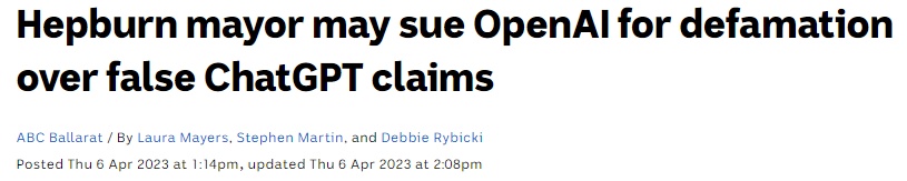 人民網(wǎng)訊 據(jù)澳大利亞廣播公司報道,近日,澳大利亞赫本郡(Hepburn Shire)郡長布賴恩·胡德(Brian Hood)指控OpenAI公司開發(fā)的聊天機器人ChatGPT對其進行誹謗。胡德發(fā)現(xiàn),ChatGPT稱他與一起賄賂丑聞有關(guān),并“謊稱”他有罪。胡德的代理律師表示,正在準備對OpenAI公司提起訴訟。