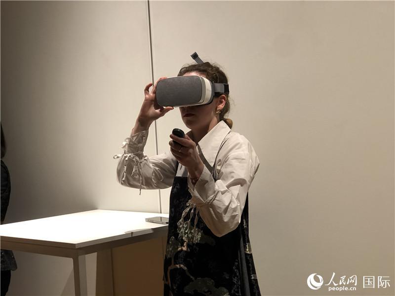 | 嘉賓通過虛擬現(xiàn)實(shí)眼鏡了解古蜀文明。人民網(wǎng)記者 劉玲玲攝 |