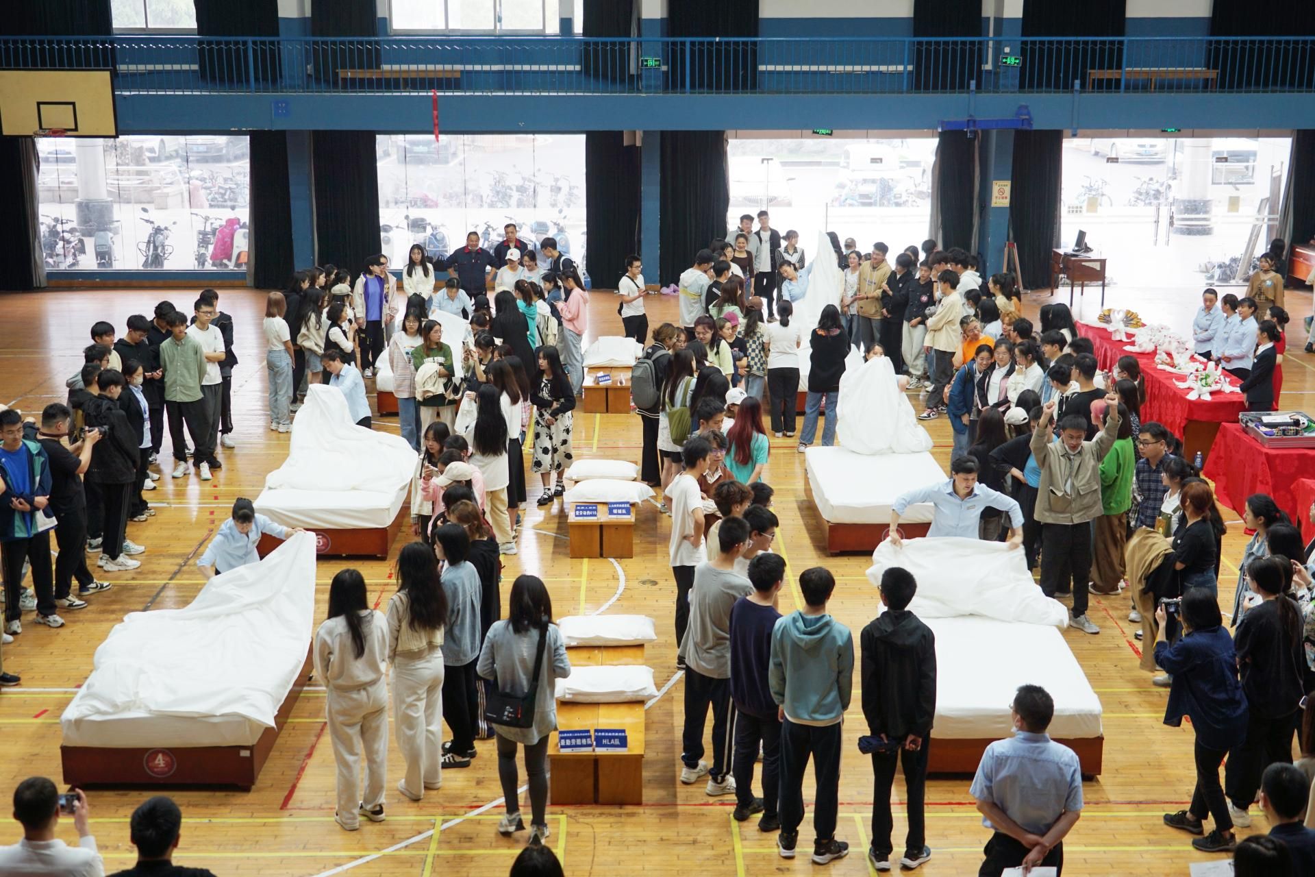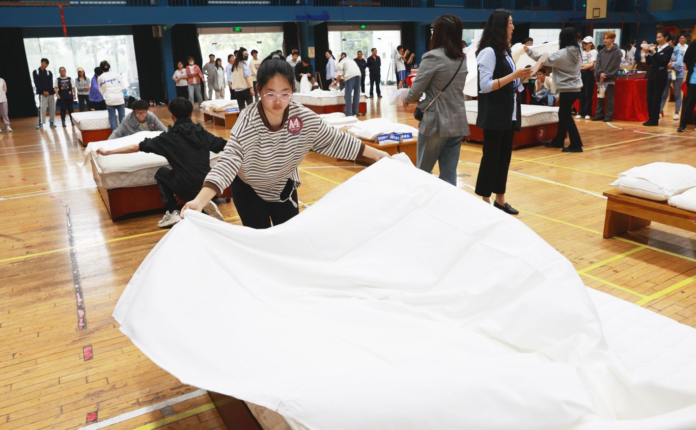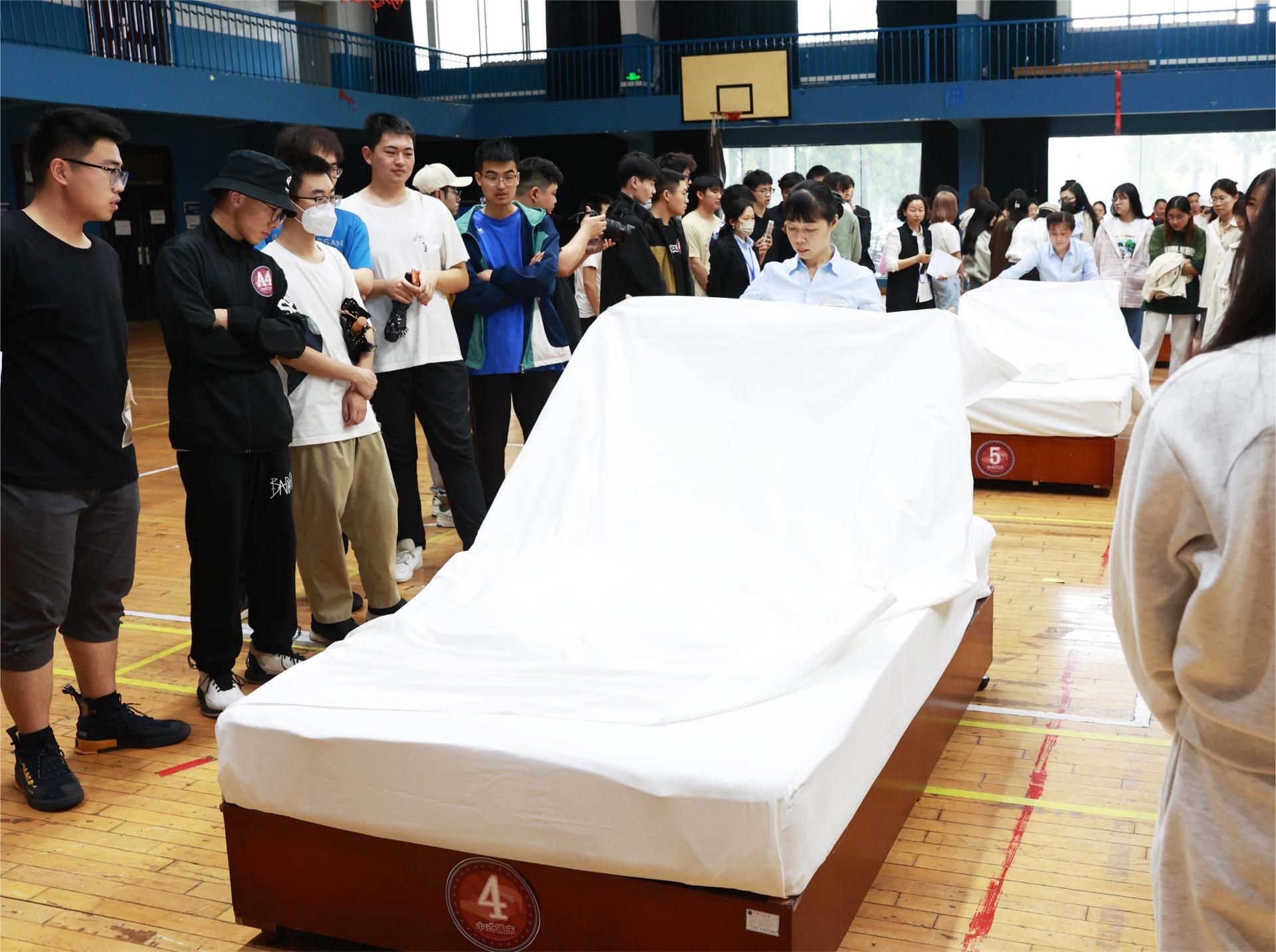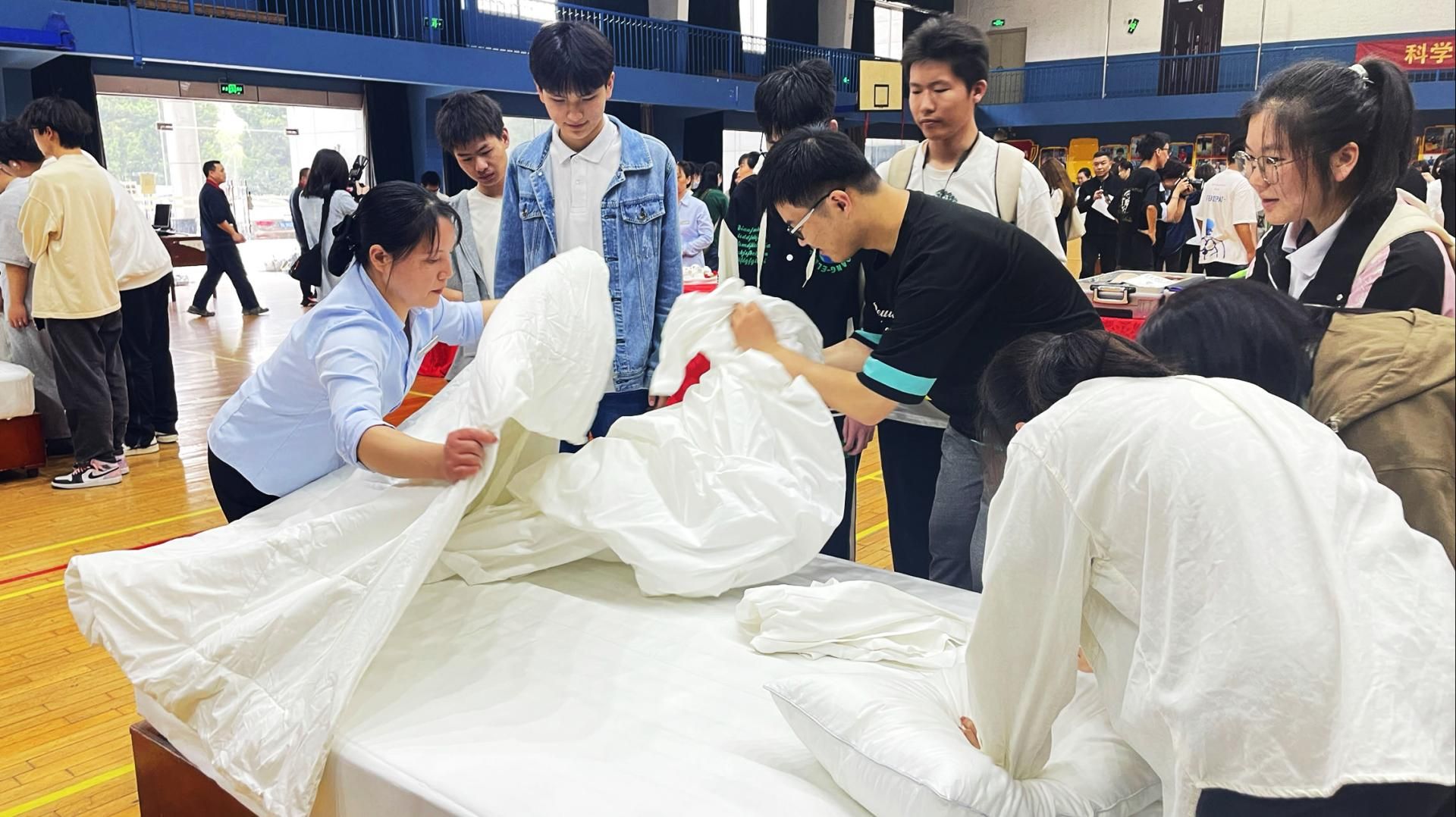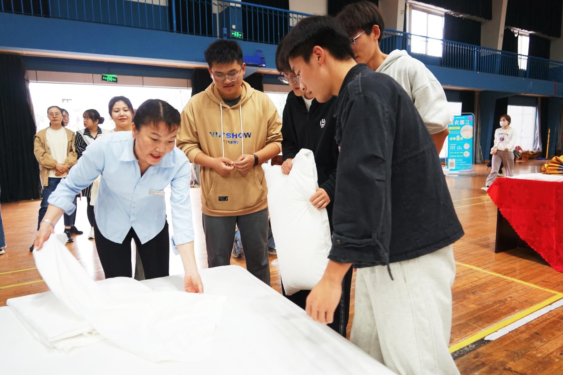比賽設(shè)置中式鋪床及衣物折疊兩個項目,先由后勤保障部工作人員進(jìn)行示范講解,同學(xué)們觀摩后動手實踐,最后現(xiàn)場比賽,現(xiàn)場氣氛非常熱烈。