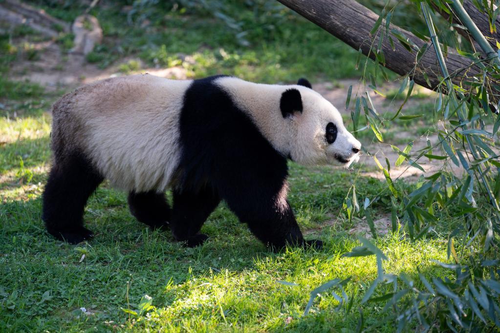 4月19日,在美國華盛頓史密森學(xué)會國家動物園,大熊貓“小奇跡”在散步。新華社記者劉杰攝
