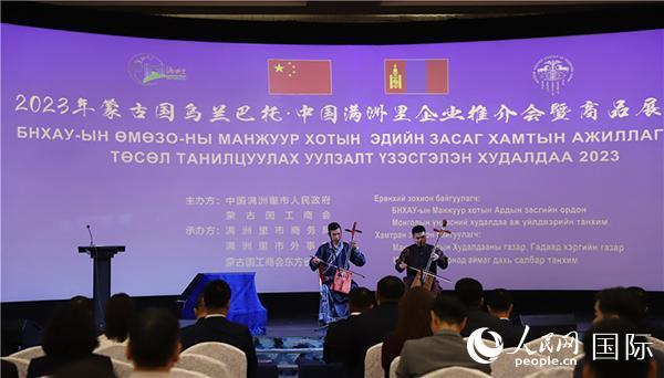 | 蒙古國烏蘭巴托·中國滿洲里企業(yè)推介會暨商品展示會開幕式。人民網(wǎng)記者 霍文攝 |