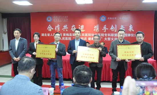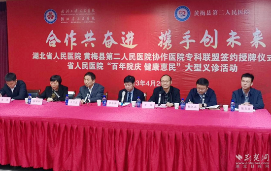 荊楚網(wǎng)(湖北日?qǐng)?bào)網(wǎng))訊(通訊員劉學(xué)平)4月23日,湖北省人民醫(yī)院和黃梅縣第二人民醫(yī)院(孔壟鎮(zhèn)衛(wèi)生院)協(xié)作醫(yī)院專科聯(lián)盟簽約授牌暨省人民醫(yī)院“百年院慶 健康惠民”大型義診活動(dòng)在黃梅縣孔壟鎮(zhèn)舉行。