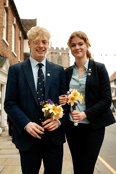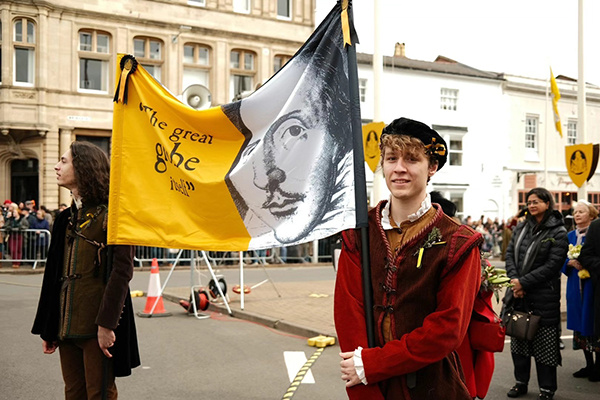 當(dāng)天四面八方的游客到來,給如詩如畫的小鎮(zhèn)增添了許多熱鬧氣氛。上午十時(shí)左右,斯特拉特福當(dāng)?shù)刂行W(xué)生以及來自世界各地代表組成的游行隊(duì)伍從市政廳出發(fā),一路走到中心廣場(chǎng)。數(shù)千市民游客聚集在街道兩旁,手持鮮花,為游行隊(duì)伍歡呼。游行隊(duì)伍里撫州市的代表們不時(shí)與市民游客互動(dòng),一同感受此刻的美好。一面印有莎士比亞頭像的黃色旗幟迎風(fēng)展開,各國國旗紛紛懸掛在街頭,當(dāng)?shù)孛癖姾陀慰妄R唱生日歌,向這位文壇巨匠致敬。來到斯特拉特福,不僅能近距離感受莎士比亞,也能“遇見”湯顯祖。薩翁故居以及市政廳里中國文學(xué)巨匠湯顯祖的塑像及有關(guān)介紹,吸引了不少游客的目光。