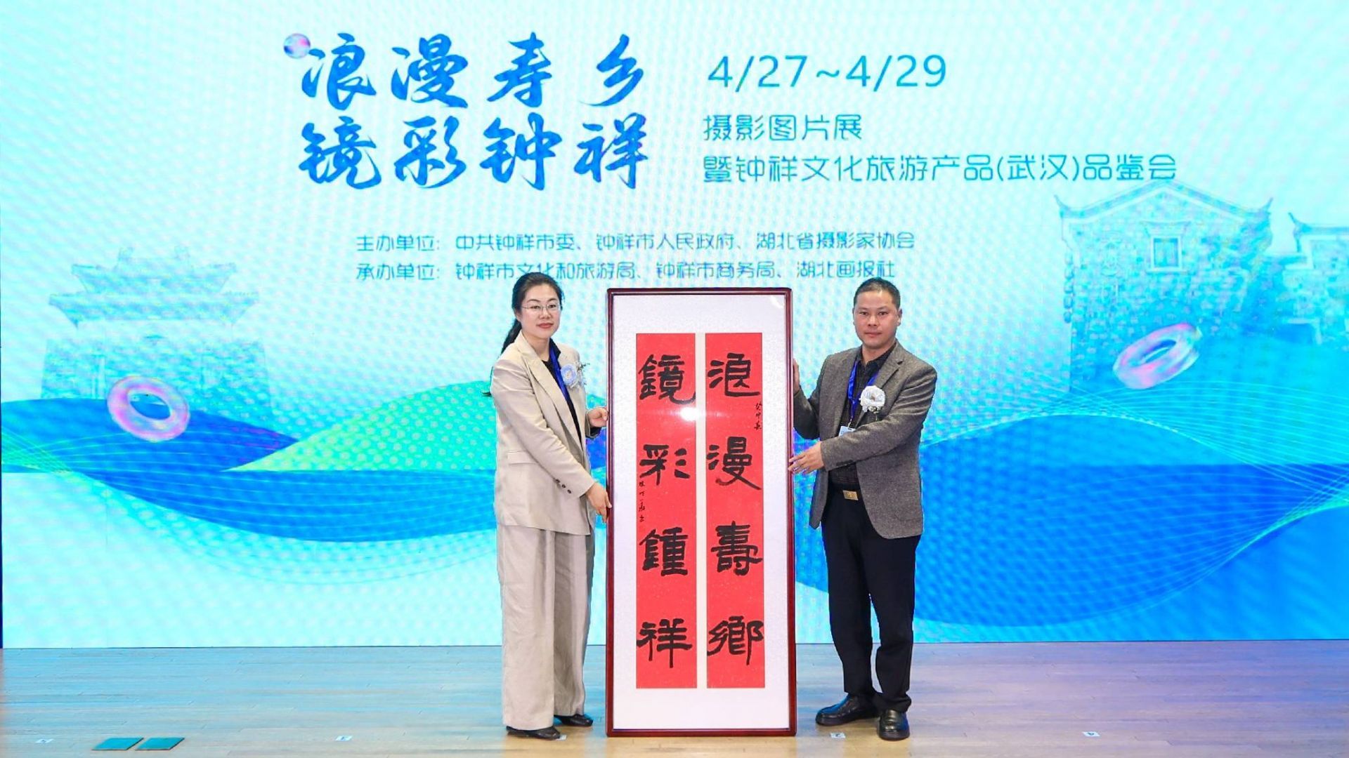 隨后,中國書法家協(xié)會會員、湖北畫報(bào)社董事長陳明華向鐘祥市文旅局局長郭慶贈(zèng)送書法作品《浪漫壽鄉(xiāng) 鏡彩鐘祥》,蒼勁有力、飄逸自如的作品,寫盡了長壽鐘祥的詩意浪漫。