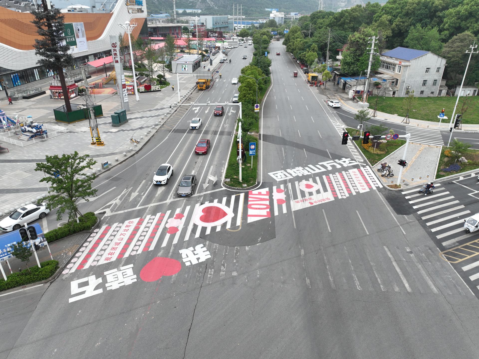28日上午,在多個(gè)視頻平臺(tái)里,出現(xiàn)了一條黃石“網(wǎng)紅斑馬線”,這條斑馬線位于磁湖路與廣州路路口靠近團(tuán)城山萬(wàn)達(dá)廣場(chǎng)一側(cè),不少市民來(lái)到現(xiàn)場(chǎng)打卡拍照,還有市民在現(xiàn)場(chǎng)拍攝視頻。記者隨后來(lái)到現(xiàn)場(chǎng)看到,這條原本黑白相間的斑馬線,被涂畫(huà)了桃心、花朵圖案,并配上了“團(tuán)城山萬(wàn)達(dá)”“我在團(tuán)城山萬(wàn)達(dá)等你”“我在等風(fēng)也在等你”“我在黃石很想你”“我 黃石”“LOVE”等字樣?,F(xiàn)場(chǎng)確實(shí)也有些市民掏出手機(jī),對(duì)這條斑馬線進(jìn)行拍攝。