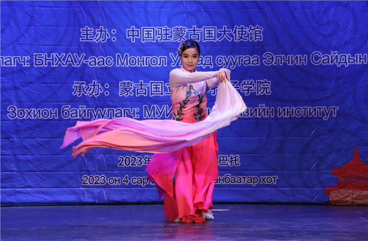| 優(yōu)秀獎(jiǎng)選手表演舞蹈《媚》。蒙古國(guó)立大學(xué)孔子學(xué)院供圖 |