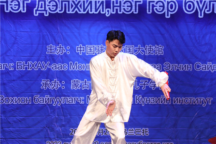 | 優(yōu)秀獎(jiǎng)選手表演《太極扇》。蒙古國(guó)立大學(xué)孔子學(xué)院供圖 |
