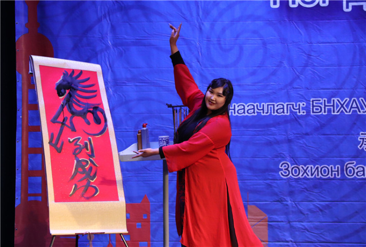| 優(yōu)秀獎(jiǎng)選手表演書(shū)法民族舞。蒙古國(guó)立大學(xué)孔子學(xué)院供圖 |