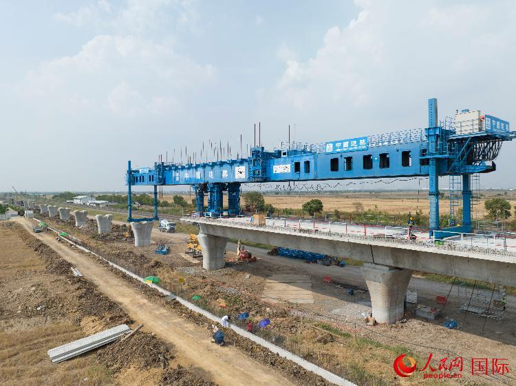 | 中國建筑工人在中泰鐵路項目4-3標段進行預(yù)制梁施工。人民網(wǎng)記者 孫廣勇攝 |