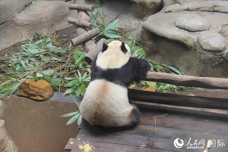 記者趕到時,離開爸爸媽媽單獨生活的“圓夢”正躺在木床上呼呼大睡,四仰八叉的可愛模樣吸引游客們紛紛駐足,拍照留念。動物園工作人員介紹說,“圓夢”現(xiàn)在已經五歲多了,體重超過100公斤,身高也同成年大熊貓無差,活潑好動、元氣滿滿。隨著飼養(yǎng)員往園內投入新鮮的竹子,“圓夢”也慢慢醒過來,開始享用竹子大餐。“我可以一整天在這里看它吃飯!真的太可愛了!這是我在動物園最喜歡的動物!”今年8歲的梅麗莎興奮地說。