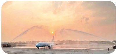 四月二十六日,廈門—仰光航線恢復(fù)直航,緬甸仰光國際機(jī)場以“過水門”儀式歡迎該航班的到來。