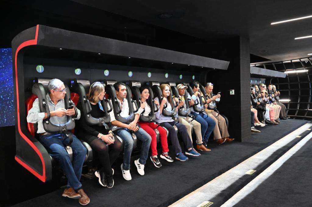 5月2日,洪都拉斯媒體代表團(tuán)一行在重慶市規(guī)劃展覽館體驗(yàn)“飛越重慶”飛行影院。新華社記者 趙佳樂 攝