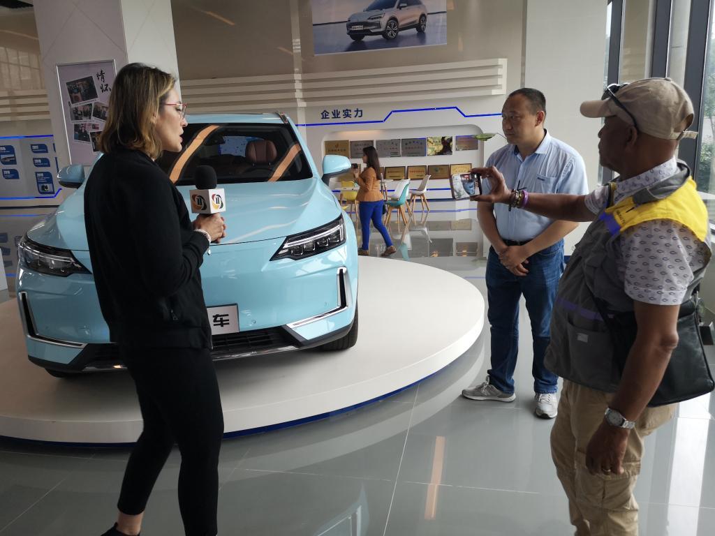 5月4日,洪都拉斯媒體代表團(tuán)成員在南京一家汽車企業(yè)報(bào)道新能源汽車產(chǎn)銷情況。新華社記者 陸華東 攝