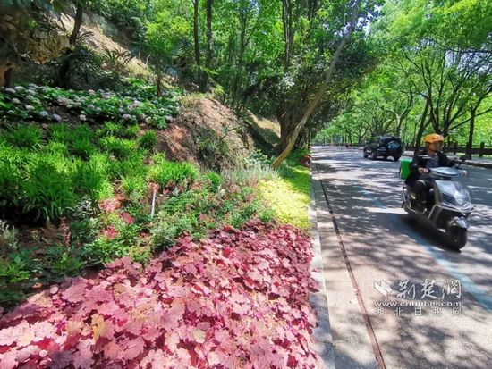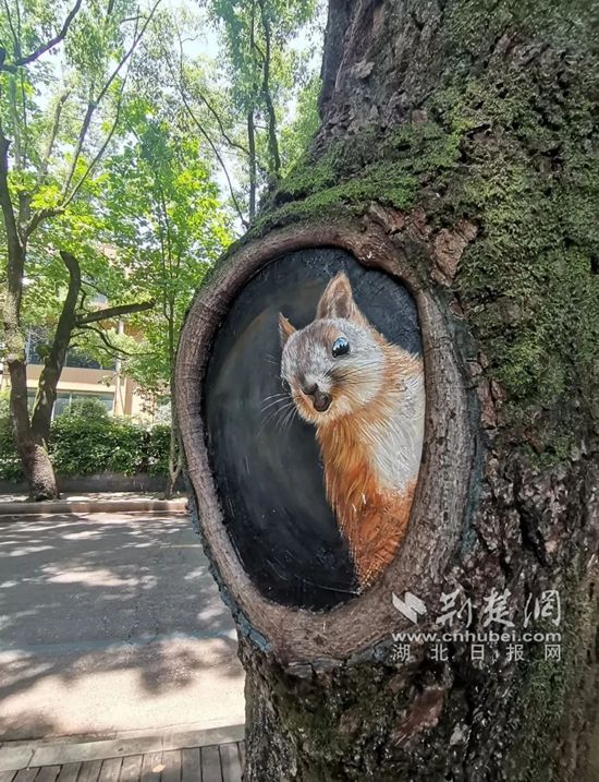 從溫泉谷到黨校入口處的山體雜草和垃圾已清理干凈,種上了耐陰的繡球花、彩葉草、網(wǎng)紋草等花草,展現(xiàn)出別樣風(fēng)情;街對(duì)面的道行樹(shù)上放上了仿真松鼠、貓頭鷹和桂花,樹(shù)洞橫截面“長(zhǎng)滿(mǎn)”了松鼠、龍貓,淦河邊步道旁磚砌的窨井蓋因勢(shì)利導(dǎo),做成了樹(shù)樁的模樣,配上微塑蘑菇,幾可以假亂真;電箱穿上了風(fēng)景類(lèi)的彩繪新衣……栩栩如生的小動(dòng)物和與周?chē)h(huán)境渾然一體的彩繪,讓新升級(jí)的月亮灣網(wǎng)紅路“萌化”了!