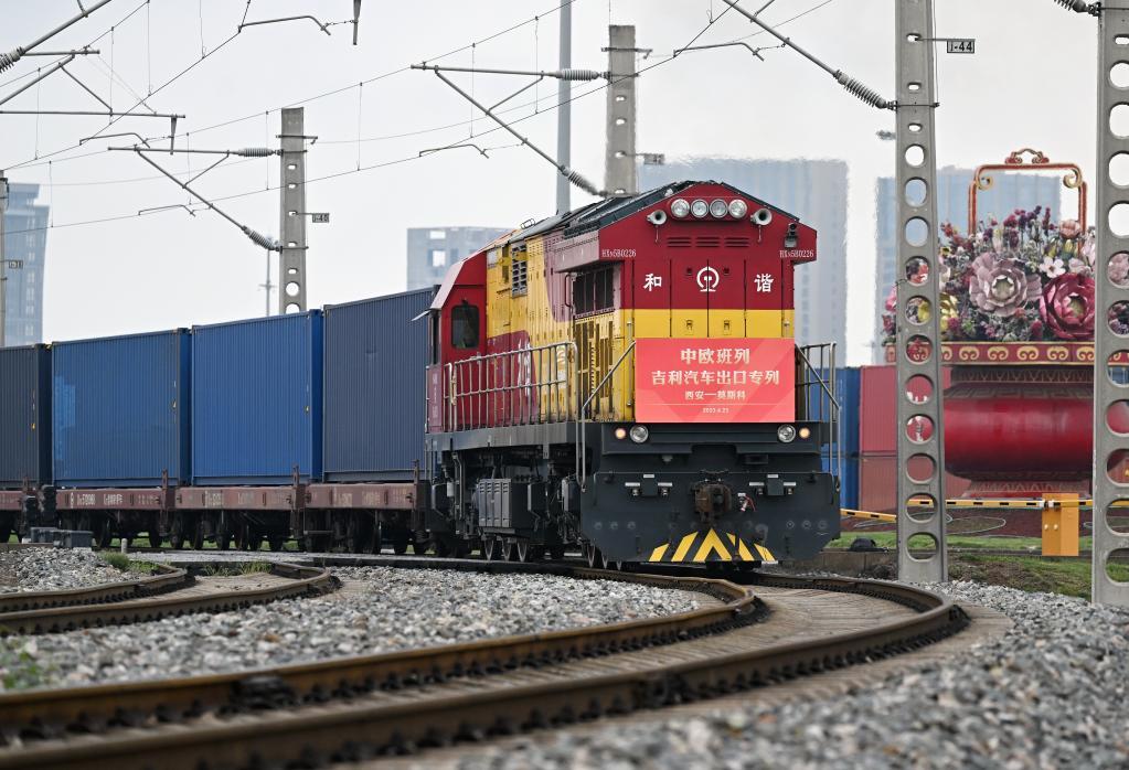 4月23日,中歐班列長安號(hào)吉利汽車出口專列從西安國際港站駛出。新華社記者 李一博 攝