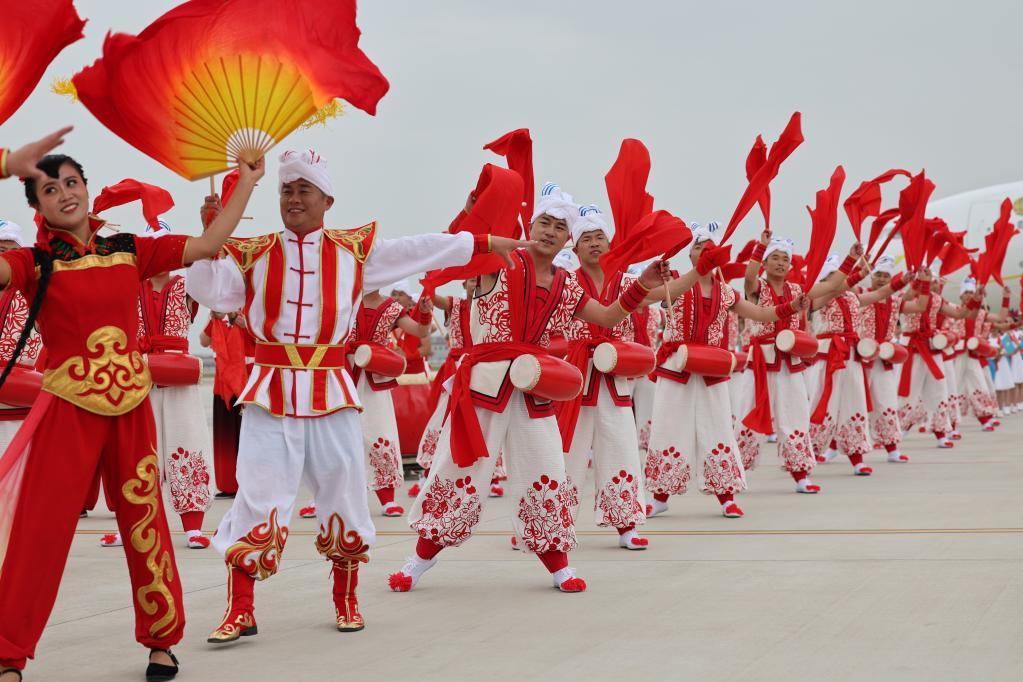 5月17日下午,當(dāng)?shù)孛癖娫谖靼蚕剃枃H機(jī)場以熱情的腰鼓、歡快的秧歌等民間藝術(shù)表演歡迎中亞國家貴賓到來。新華社記者邢廣利 攝