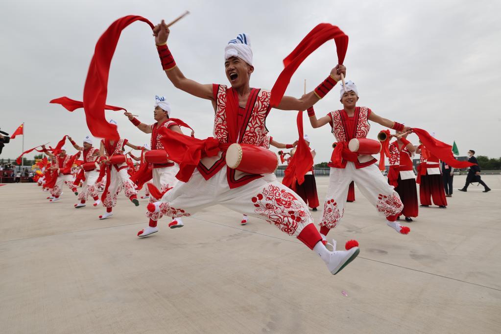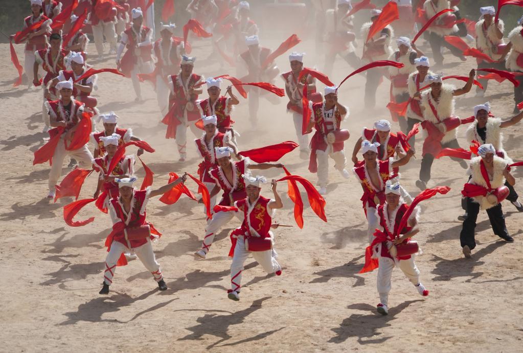 2018年5月25日,演員在景區(qū)內(nèi)表演安塞腰鼓。新華社記者邵瑞 攝