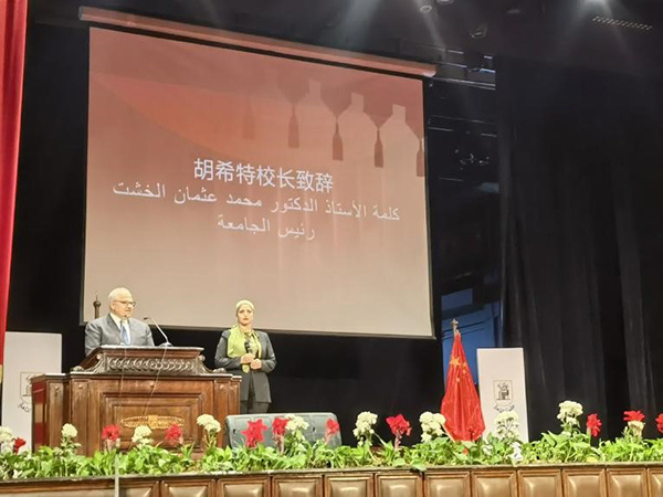 | 圖為開(kāi)羅大學(xué)校長(zhǎng)胡希特致辭。人民網(wǎng)記者 沈小曉攝 |