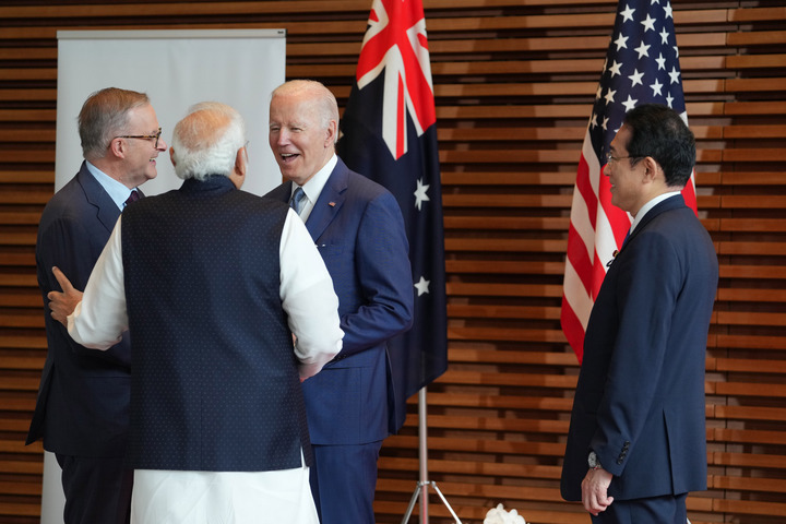 2022年5月24日,在日本東京,澳大利亞總理阿爾巴尼斯、印度總理莫迪、美國(guó)總統(tǒng)拜登和日本首相岸田文雄(從左到右)在美日印澳“四邊機(jī)制”峰會(huì)的歡迎儀式上交流。新華社記者張笑宇攝