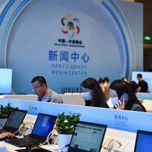 5月16日,記者在中國(guó)—中亞峰會(huì)新聞中心工作。新華社記者 張博文 攝